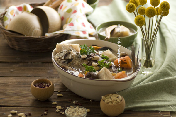 粉葛又名葛根,主治外感發熱,可解肌退熱,生津止渴,升陽止瀉,配搭溫中下氣的白鯽魚,有健脾去濕,開胃,補虛強身的食效。加上扁豆、赤小豆都是健脾去濕的藥材。肥丁很少吃淡水魚,不過這湯適合「肥人多濕」的熊貓先生,肥丁每逢轉季都會買齊材料,除了基本的食材外,還加入紅蘿蔔、蜜棗,湯味更甜。粉葛、赤小豆、扁豆偏寒涼,必須有果皮平衡虛實,是不可或缺的啊 ~