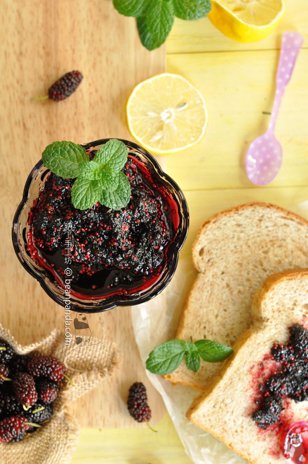 品嚐天然美味的桑椹果醬,也許是比化學護膚品更好的另一個選擇。桑椹在每年 3 至 5 月清明節前後採收,今年的桑椹應該很豐收,幾乎所有水果檔都有售,以 HKD 10 元 2 盒促銷,肥丁當然不會錯失良機,可惜桑椹不易保存,多碰撞幾下便會出水,除了鮮吃,還可以製成果醬和果醋。肥丁不愛喝醋,製成果醬比較簡單。成熟的桑椹呈深紫色,肉厚油潤,味甜多汁,糖份十足,肥丁第一次試作時不小心多加冰糖,熊貓先生也覺得過甜,以下的配方是減糖後的份量,加入薄荷葉,添淡淡的清爽。桑椹的果膠很豐厚,減糖也可以產生足夠的果膠。