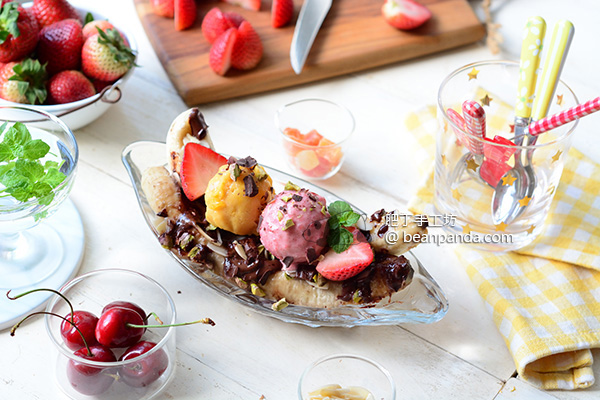 香蕉生吃香甜,烤熟後又是另一番風味。用錫紙(鋁箔紙)包好,香蕉裡面的香甜被烤出來,有一種成熟豐富的香味,軟糯適中,容易入口。烤香蕉的同時,加一點黑巧克力融化在香蕉上,杏仁薄片和開心果烤出堅果的香氣,挖兩個不同口味的水果冰淇淋球,搭配草莓裝飾,孩子們最愛的甜點 ~ 賞心悅目的烤香蕉船登場了,迫不及待想要品嚐,暖暖的香蕉和冰冰的冰淇淋,口感好特別。