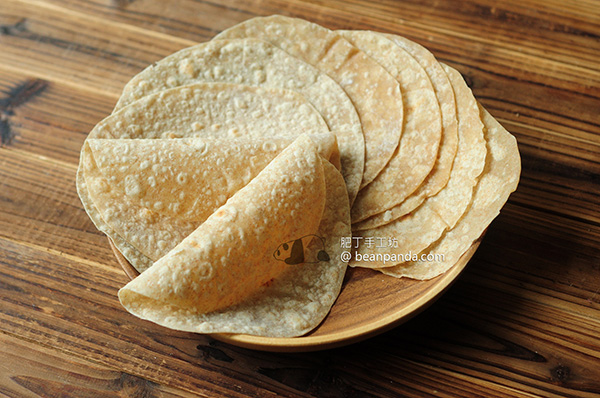 以前肥丁做過免油炸 墨西哥玉米脆片,主要材料是墨西哥薄餅的傳統材料 Masa Harina。Masa Harina 是處理過的玉米以清水泡過濕磨成粉,再乾燥成幼細的玉米粉。家裡剛好沒有 Masa Harina,改做麵粉薄餅 Flour Tortilla。很多西方食譜加入泡打粉 Baking Powder 使麵糰膨鬆,只要懂得處理麵糰的起筋狀態,不加入泡打粉也可以做出柔軟的薄餅,我喜歡有點韌勁的薄餅,所以麵糰不加入酵母發酵。