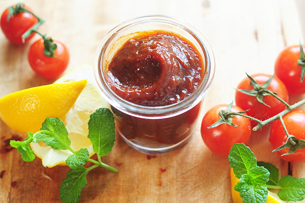 櫻桃番茄用流水沖 10 分鐘,清洗乾淨。切半,整齊排列在烤盤上,200C 1 小時,烘至半乾,出爐,放涼。加入蒜粉、洋蔥粉,紅酒醋,芥末籽,用調理機打成濃稠的番茄醬