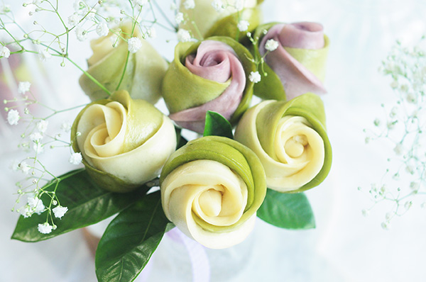 春天到了,玫瑰花開了,小小加工,做成經典網紅玫瑰花饅頭,每一口都吃得心花怒放。用抺茶粉和紫地瓜粉調出漸變色,清新脫俗,夢幻精緻。每一片玫塊花擀薄需時,做型饅頭在擀壓後,由於麵糰裡面加入了酵母,捲起來時容易產生氣泡,肥丁沒有特別的妙招,只是將未用的麵糰通通丟去急凍,讓酵母睡覺就不會產生氣泡,只要在 1 ~ 2 小時內完成整形,麵糰不結冰就沒問題,若是結冰了轉移到冷藏室退冰就可以了。不幸發現饅頭表面有氣泡,也不用灰心,用針刺穿氣泡,蒸好的麵糰一樣光滑。
