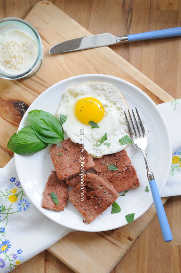 婚後肥丁都沒買過午餐肉,不過回憶這東西是很難抗拒的,經過超巿貨架的時候,會無意識地留意午餐肉的價格,如果自己製作,糖鹽脂肪的比例得以控制,午餐肉也可以吃得健康。做法不算麻煩,因為沒有添加劑,所以肉質不及巿售的 Q 度和彈性,但是用料天然且實在,手工剁碎的肉醬蒸熟後肉質鬆化有嚼勁,肉香豐富撲鼻,吃的時候盡量切薄一點,將兩邊煎至金黃,每餐一片起兩片止,配合蔬菜一起吃,就更健康了。