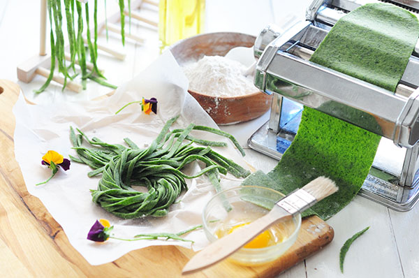 混合中筋麵粉和 Semolina 小麥,用網勺過篩。在小麥粉中間鑽凹槽,注入一半菠菜泥,橄欖油及海鹽,用指尖將周圍的麵粉撥入中央,完全混合後,注入剩下的菠菜泥,用刮板將周圍的麵粉撥往中心,直至麵粉完全吸收蛋液
