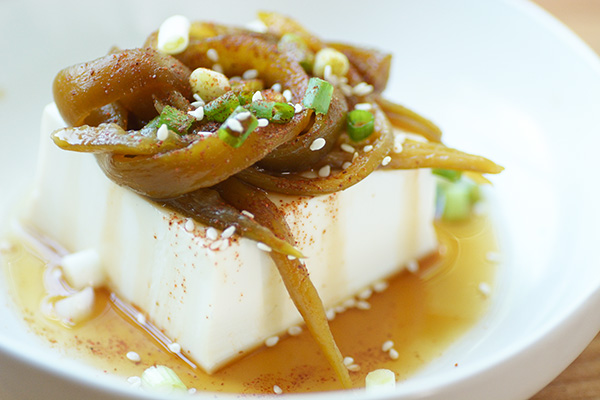 夏天特別想吃低熱量的涼拌菜,切絲,拌蒸熟的軟豆腐,蔥花,淋上醃漬的醬汁,隨意加入辣椒粉、白芝麻,香辣的醬汁滿口生香。