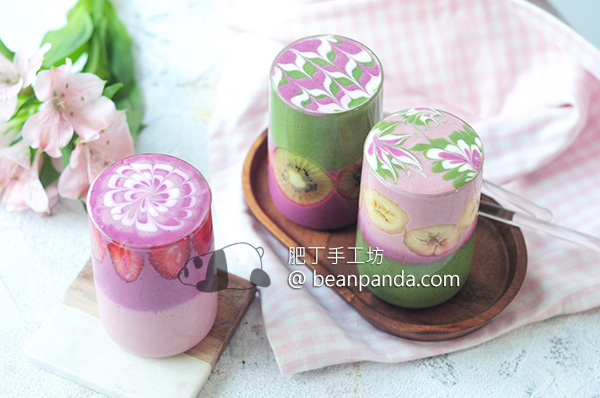 喝咖啡的人總喜歡先欣賞用泡沫做出的拉花,所謂眼球先吃。拉花並不是咖啡的專利,果昔也可以,也沒有想像中的難,紅配綠強烈對比之間加入潔白椰漿讓線條更突出,效果好看極了,精緻的拉花讓人瞬間好心愉悅,非常治癒。肥丁亦畫得不亦樂乎,拉花一杯又一杯,然後問題來了,果昔太好看,怎麼捨得喝下去﹗