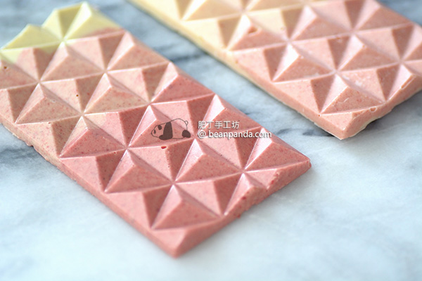 用研磨機打磨成草莓粉,冷凍真空乾燥,經冰晶直接昇華,去除水份,能保留草莓的天然色澤,染色巧克力 效果非常好,草莓粉很快受潮,磨粉後立刻放入夾鏈袋,密封。
