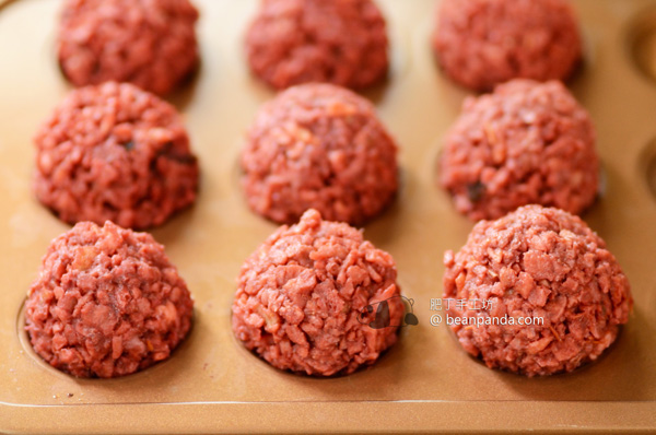 9. 用湯匙挖,用手輕壓捏圓,推圓,放在圓形蛋糕模裡,冷凍凝固,吃的時候加熱,冷凍成肉丸的模樣