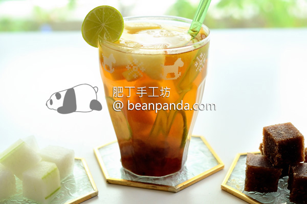 3. 冷飲:加入1/3 熱水待糖磚完全溶解,加入2/3涼開水, 也可加入喜歡的水果,如芒果、鳳梨、蘋果等,加入青檸檬,冰塊,即可享用
