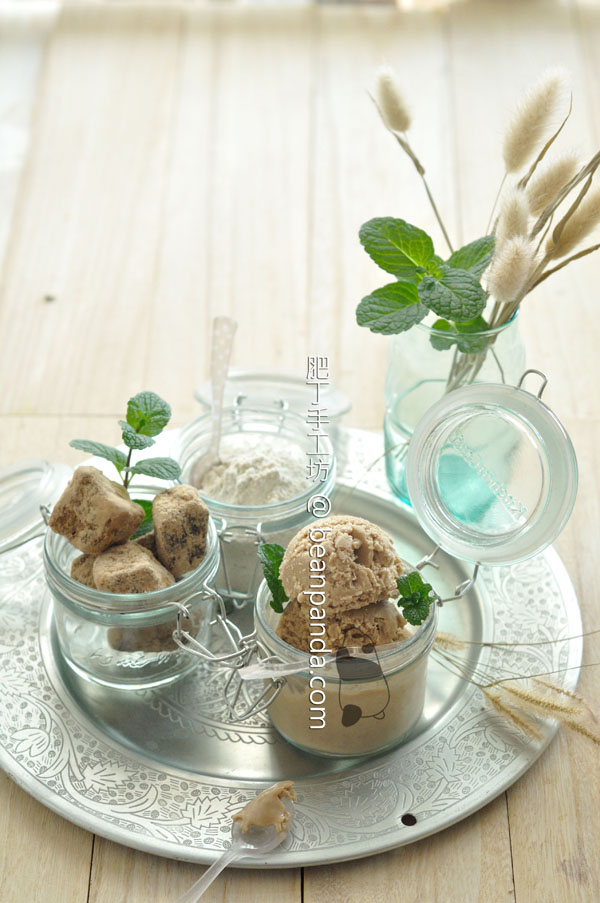 滿街行人換上了短薄衣衫,夏天又到了,很想吃雪糕啊 ~ 可是每一次製作雪糕,心裏總要掙扎一番,因為家裏有個「食神託世」(熊貓先生的爸爸給他兒子取的名號),to make or not to make…… 唉 ~ 肥丁從材料再思考,記得以前做蕎麥煎餅時,發現蕎麥麵粉加水黏性頗佳,質感如蛋一般綿密,冷藏攪拌可模仿雪糕的口感,完全不含蛋奶 (雪糕熱量的主要來源),適合全素者,零膽固醇,熱量較低 ( 糖也會肥唷 ~ 食量要節制 )。蕎麥麵粉本身有甘苦味,適合搭配味道濃郁的食材,例如黑糖、咖啡、紅茶或綠茶,把熱水換成以上的飲品,便可做出不同的味道,糖當然也可以轉擙別的種類,份量要請大家自己斟酌囉 ~