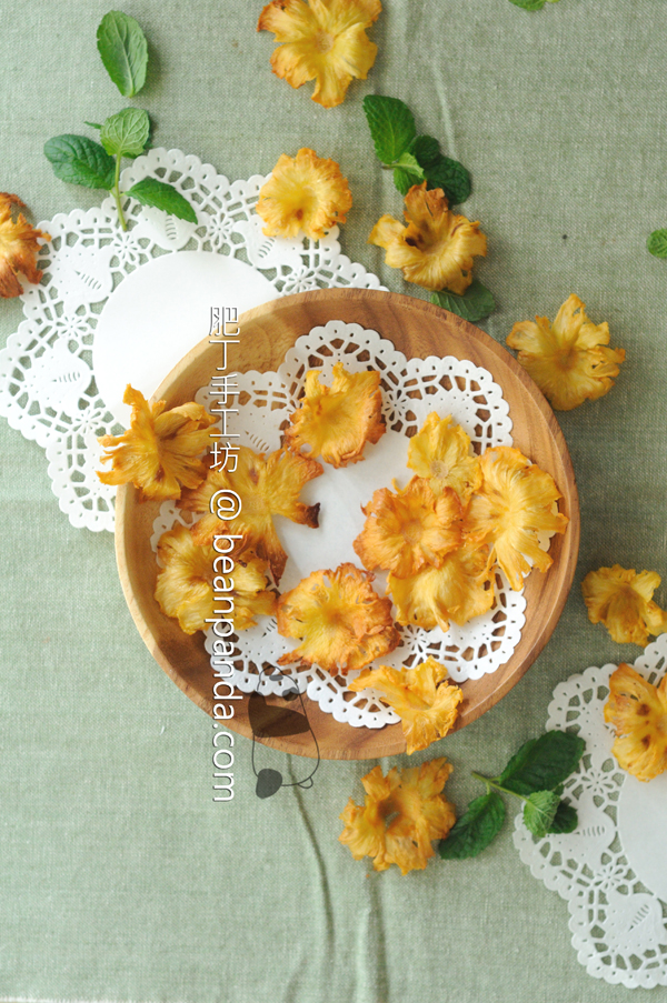 手指割傷已經三星期了,給肥丁無敵的理由躱賴怠工,看了二十本小說,三齣電視劇。可能天氣太熱,拆線後曾有紅腫發炎跡象,塗了專門治療刀傷的軟膏,明顯轉好,雖然仍然不能沾水,可以活動打字了 ( 但動太多還是會痛 T.T ~ ),分享一個簡單,好吃又好看的菠蘿花乾食譜。不須用糖醃,切片菠蘿放在圓弧模裏烘乾,宛如一朵朵盛放的太陽花,吃起來甜酸爽脆,可放在杯子蛋糕或沙拉上作裝飾。