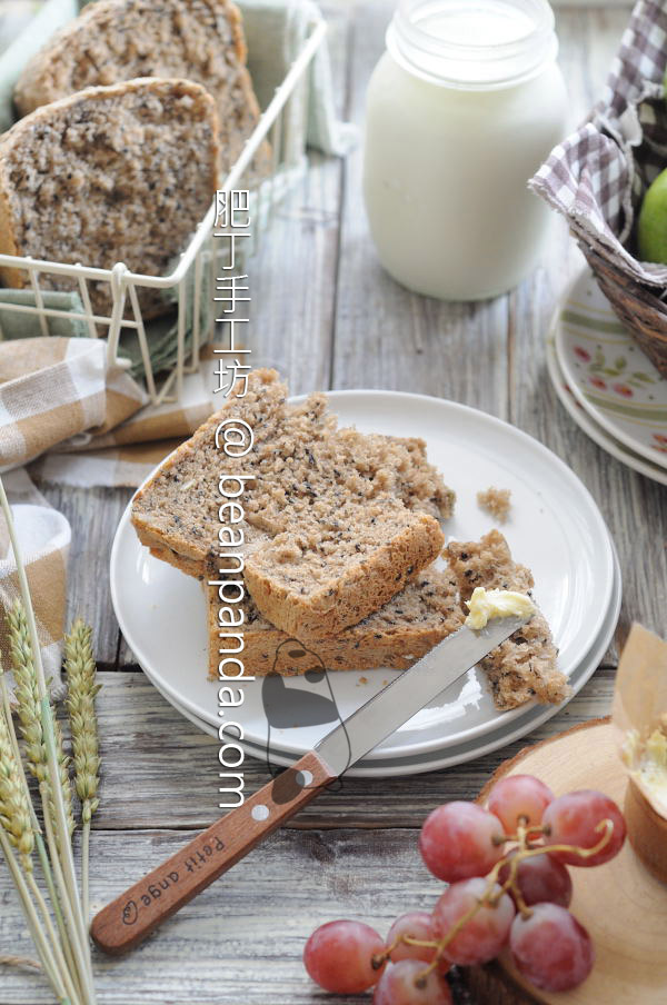 朋友喜歡吃的多穀麵包預拌粉,主要是精製白麵粉加入少許裸麥 ( Rye Flour ) 、燕麥、葵花籽之類的種籽,裸麥的比例很低 ( 那預拌粉做出來的麵包很白,裸麥麵包應該是深色的 ),令消費者看上覺得很健康。肥丁做的版本盡可能加強裸麥的比例,由於裸麥中的蛋白質形成的麵筋黏性較重,起筋後氣泡不多,使麵糰變得厚實,只要加入醋便可以讓麵糰膨鬆,烤好才不會實甸甸的。裸麥麵包顏色較深,有一種特別的香味,麵包較為鬆散,加上燕麥及多穀種籽,札實而有咬勁,特別適合塗牛油吃 ﹗
