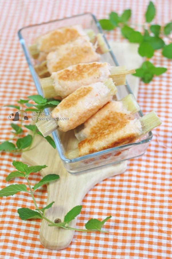 5. 蝦膠很黏手,在拿起前隻手先沾水,蝦膠便不黏手了。抓起一份蝦膠,放在手心,壓平,上面放竹蔗,用手握著包圍竹蔗,如果很黏,雙手再沾些水