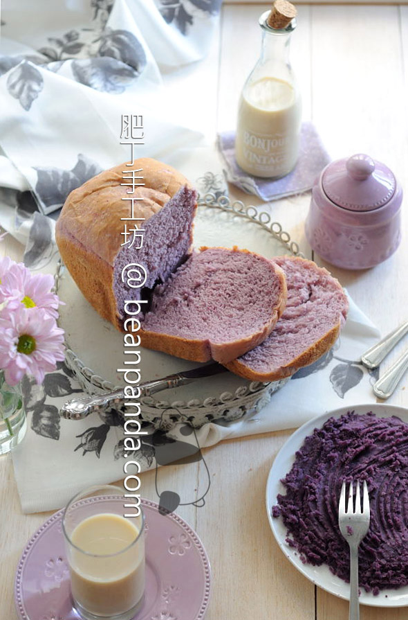 紫薯當令又便宜,肥丁很貪心想盡量提高紫薯的比例,不過紫薯澱粉質含量高,如比例太高可能會使麵包變硬,所以選了湯種,湯種保濕度高,組織輕柔,加入紫薯後麵包組織仍然鬆軟。很多湯種配方需要大量的牛油、糖和蛋。肥丁稍為改良,不用蛋,牛油減至最少。麵包淡淡的紫色太好看,果醬也可以省了 ﹗