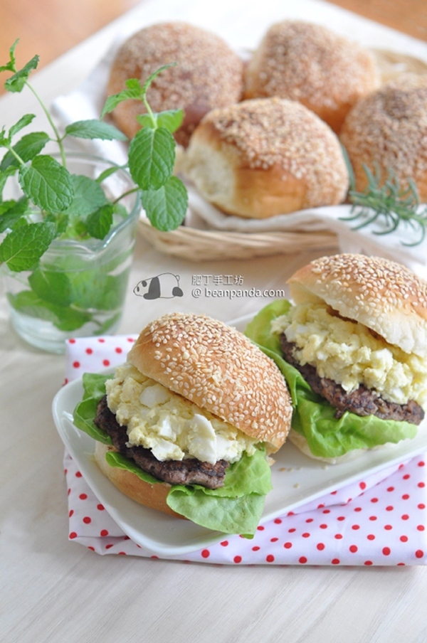 家庭主婦最頭痛的就是弄午餐,份量少,又不能太馬虎 (肥丁是處女座)。牡丹樓也不能常常去呀 ﹗漢堡包自己做也可以啊 ﹗ 用湯種法就 ichiban 啦 ﹗鬆軟甜麵包舖著香脆的芝麻,還可以夾自家製的漢堡牛扒,新鮮生菜,蕃茄,芝士,酸青瓜…等等,配料不能太貪心唷,肥丁很喜歡碎蛋沙律,超容易做,現在先做麵包,碎蛋沙律和漢堡牛扒下回再跟大家分享 ﹗