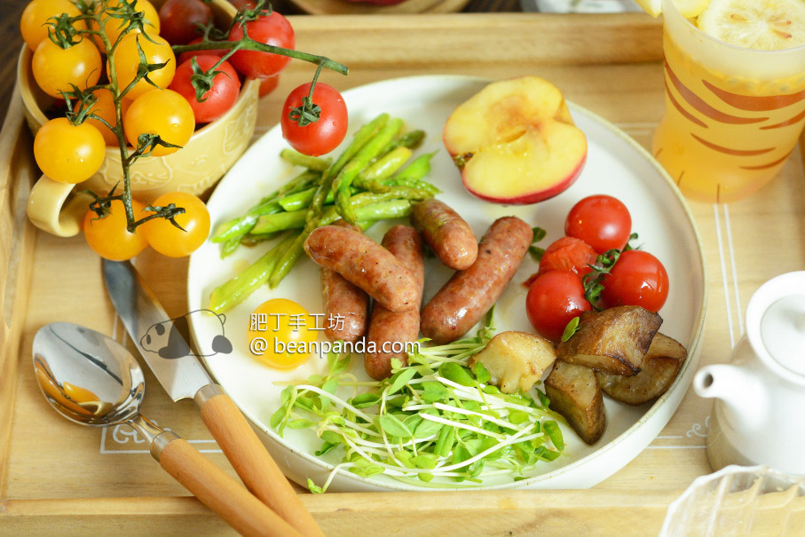 4. 不論有腸衣無腸衣的香腸,若冷凍過先退冰,食用前要再加熱,平底鍋裡,薄油小火慢煎,香腸圓柱體厚度高,注意各區溫度,每 30~40 秒滾動一次,加入蔬菜一起煎,更健康了,香腸本身己煮熟,煎至整條香腸變成金黃色起鍋