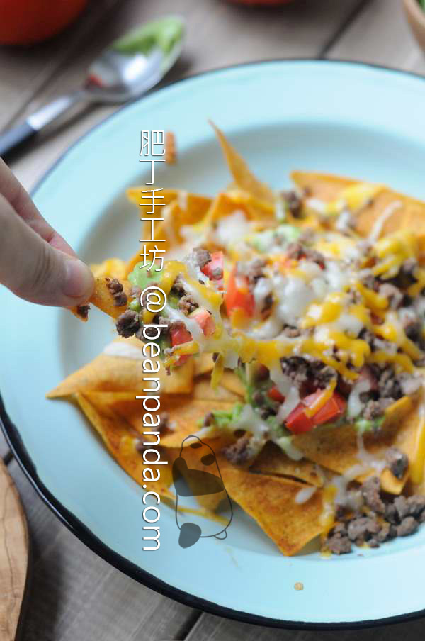 Nachos 是一道美式墨西哥餐廳裡非常受歡的開胃菜 ,把墨西哥玉米脆片排在碟上,炒點碎牛肉,用成熟的酪梨加清水打成幼滑的酥梨醬,鋪上番茄,洋蔥,起司,入爐烤至起司溶化。配料十分隨意,家裏有甚麼,味道豐富,要是加入黑橄欖和醃製墨西哥綠辣椒,就更墨西哥風了。這道玉米片料理適合當下酒小食、開派對、或一家人欣賞影片的時候品嘗。