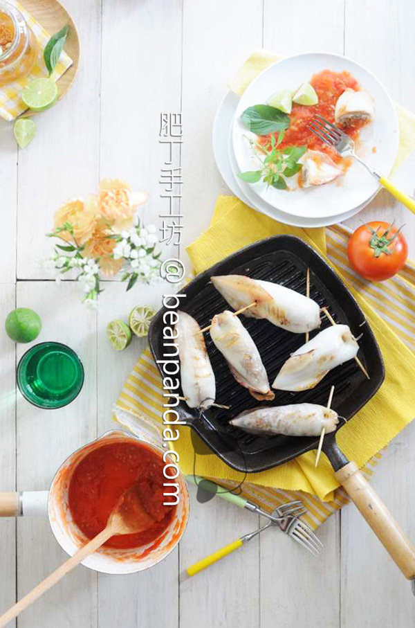 8. 魷魚蒸熟後會膨脹起來,用平底鍋中火煎至微焦,切片佐番茄蘸汁,盛盤
