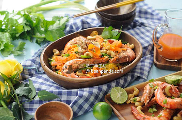 - 炒蔬菜 ~ 加入水芹菜的莖和紅蘿蔔,炒香,炒至你喜歡的硬度,紅蘿蔔炒愈久質感愈軟,加入泰式甜辣醬,讓蔬菜沾上醬汁,加入芹菜葉,加入已炒熟的豬肉、蛋及蔥花,快速拌勻,離火,鋪上虎蝦,加少許青檸汁,即可享用