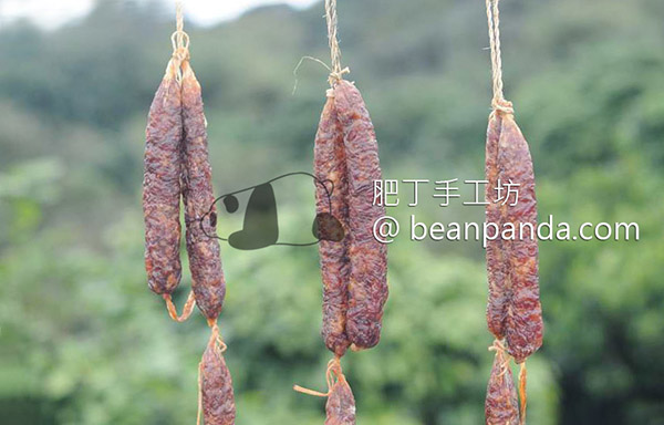 - 豬腸衣比羊腸衣直徑大和堅韌,製成品的直徑和巿售的差不多,肉的直徑厚嚼勁較好,不過風乾時間較長,增加變壞變酸的風險