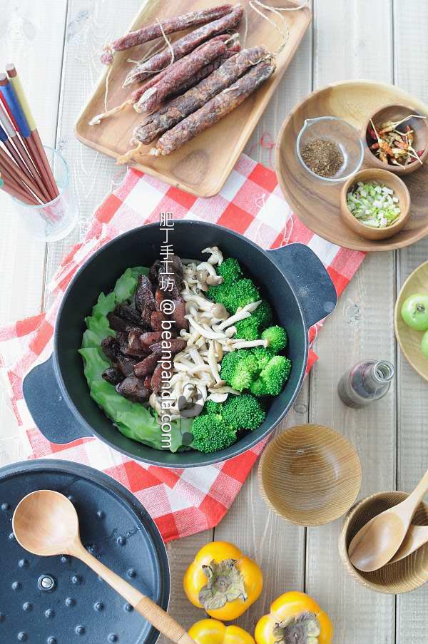 - 臘腸和潤腸斜切薄片,綠花菜倒轉,沿徑切成一朵朵,莖部斜切成厚片。鴻喜菇切根,薑片去皮薄切