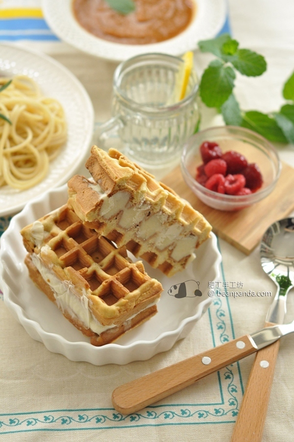 山長水遠淘了個窩夫模,只做一個食譜真是太對不起自己。今次做原味版,夾手作雪糕做三文治,非一般的美味﹗澳門禮記有售,威化餅夾雪糕,紙盒盛裝,十分懷舊,還有以磅計的雪糕磚都是肥丁至愛,來半磅雪糕樽,多豪氣﹗可惜肥丁自小有敏感牙齒,吃雪糕還好,可不用咬,慢慢細味;雪糕三文治,唯有扮優雅切小塊放入口中,一口一驚心﹗真是「為食」的代價 ﹗