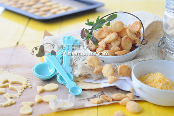 小金魚起司餅乾,很多大小孩都愛,愛那香香濃濃的起司味,愛那酥脆的口感,吃完後會忍不住不顧儀態吮指回味。肥丁也喜歡起司餅乾,就向巿售的成份表裏偷師,用熟成 6 ~ 9 個月的新鮮切達起司,味道夠香濃,切達起司本身有鹹味,不用另加鹽,加上自製的洋蔥粉和蒜粉,不添加任何人工調味料或防腐劑,純手工烘培真的好滋味。肥丁沒用麵粉,而是改為米粉和馬鈴薯澱粉,無麩質口感更酥脆。