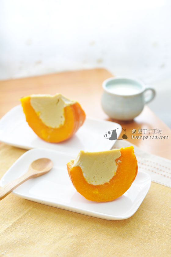 5. 將熱呼呼的南瓜從蒸鍋裏取出放涼,小心燙手。放涼後放進冰箱冷藏 2 ~ 3 小時,布丁會變更硬一點,切 4 份,wow… 漂亮的南瓜布丁誕生了﹗