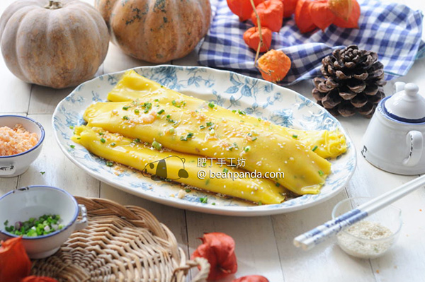 肥丁喜歡街頭腸粉的簡單又純樸,沒有餡料,質感清爽柔靱有嚼勁。在家製作也很容易, 以沾米粉開米漿,加入少量的木薯粉、玉米粉、馬蹄粉調整米漿的硬度,「整色整水」用南瓜汁使米漿變成吸睛的橙黃色,加入蝦米和蔥花。蒸熟後放涼捲起來,提起來不容易折斷,即做即吃軟滑彈牙,吃不完放進冰箱冰鮮,翻熱後爽滑依然。在家裏做腸粉,肥丁沒用布,調好粉漿,簡單一個烤盤,用蒸鍋或蒸烤爐蒸熟就能完成,快捷方便,工具又容易清洗。