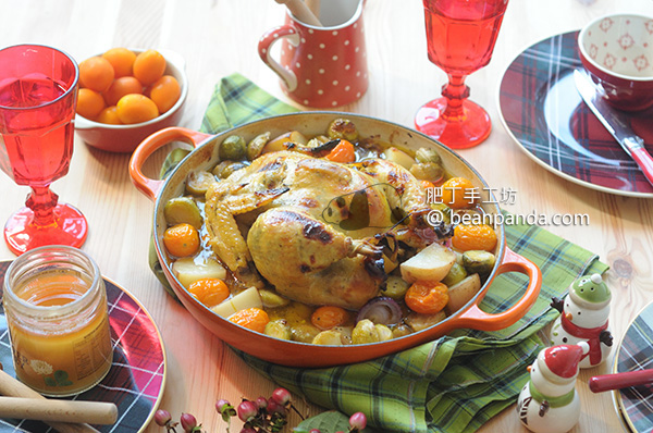 無論中西節日,雞料理都喜歡「全隻上」,明明切成部件快醃入味,烹調時間快速又節省能源,大家卻偏偏喜歡「烤全雞」,心甘情願先醃一晚,再烤 1 個小時或以上,只因為「全雞」存在感強大,豪華體面,烤全雞一出,其他的聖誕菜式頓時變成拌桌配角。聖誕節肥丁也愛做烤全雞,和蔬菜一起烤,營養均勻。這道料理沒用太多調味料,醃料只有迷迭香、檸檬、蜂蜜和奶油,和烤出來的雞汁混在一起,味道清爽,蔬菜吸收了醃汁和雞汁,味道豐富,非常好吃。