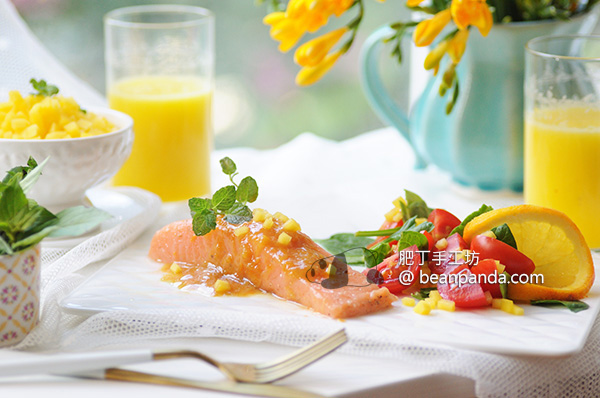 - 從蒸烤爐取出三文魚,放在上菜的盤子上,淋上香橙芥末醬汁 即可享用。 魚肉容易分離 代表熟了,魚肉未能分離 需要延長慢煮的時間