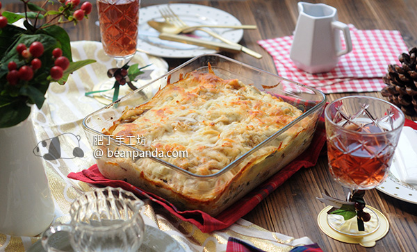 送進烤箱烘烤約 30 分鐘,整體烤熱後,調高溫度至約 220°C ~ 230°C,把起司表面烤成金黃色,取出後,靜置 10 分鐘,切開享用