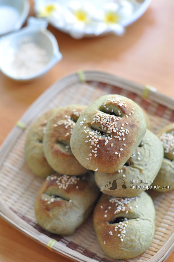 紅豆綠茶是食材界的夫妻配,甜甜的紅豆餡和甘香綠茶抹互相配合,味道一流,對不起,好像太”hard sell”了。麵面沒有掃上蛋汁,製成撲素小麵包的感覺 ﹗