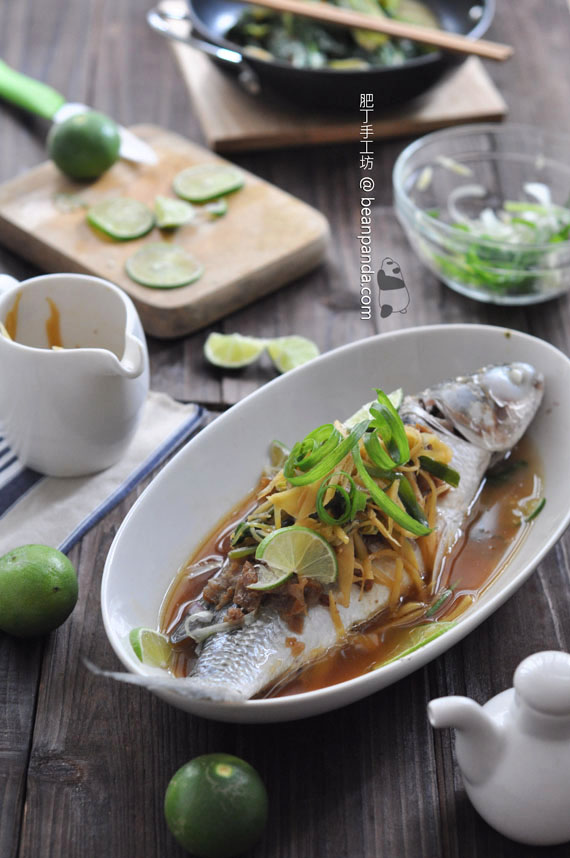 熊貓先生十分喜歡吃魚,多骨少骨鹹水淡水一樣通殺,肥丁吐骨的功夫完全不行,又被丁媽寵壞了,淡水河魚多骨很少吃。每次做這款潮州菜,肥丁只吃魚背,熊貓先生吃魚肚,很快便清理一條烏頭魚。肥美的烏頭魚,蒸熟後會滲出黃油,與鹹檸檬汁配合,魚肉嫩滑,甘香鮮美,味道天衣無縫,十分開胃,淋上薑葱酒芡汁,腥味全去。
