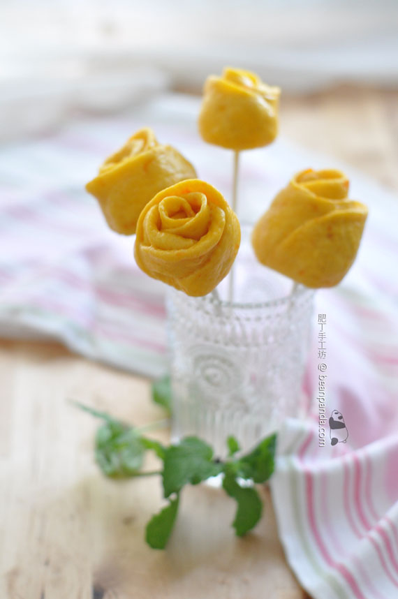 續上回,肥丁繼續清雪櫃大行動,在冰格找到一包南瓜泥,用來做麵包又用不完,就學起姑奶做玫瑰花饅頭,麵粉直接加入南瓜泥搓成麵糰,漂亮的黃玫瑰造型真是令人驚艷,賣相精緻可愛,入口鬆軟,營養豐富。運用不同的食材還可改變玫塊花的顏色,加紫薯泥變紫色,紅蘿蔔泥變橙色,波菜變綠色。再加點小心思,將饅頭插在棒棒上,更有玫瑰的神韻,是不錯的母親節禮物呢,下星期日便是母親節了,除了銀蛋策略之外,親手做玫瑰饅頭送給母親大人,一定更令她甜在心頭。