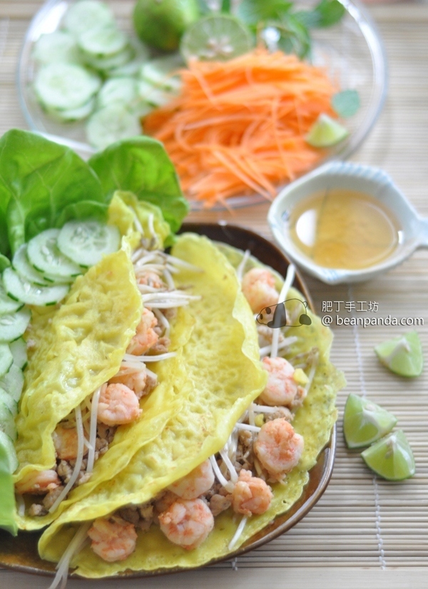 又做越南菜﹗越南菜烹調技巧不複習,可是配料特多,洗洗切切已花了你半天的時間,這款看似簡單的越南薄餅,配料已有八九樣,想吃的挑剔還要磨花生碎和椰漿。話明煎餅,當然是即做即吃,薄餅香脆,包上生菜、紅蘿蔔絲、青瓜片,夾薄荷九層塔葉醮魚露吃 (魚露製作按此),再多功夫都值得﹗
