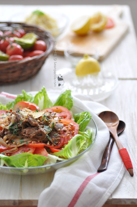 做媽媽做頭痛的,就是子女不愛吃飯。肥丁就是那個「冇飯癮」的女兒,除了酸湯,簡單的越南沙律是丁媽的第二號秘密武器,無論天氣多熱,多沒胃口,肥丁都可以扒完一大碗白飯,還想再添呢 ﹗洋葱炒牛肉,本來普普通通,配以新鮮的生菜蕃茄,紅綠對比,顏色已十分吸引味蕾,淋上混入糖、薄荷和黑椒的檸檬汁,加上花生碎的清香,產生微秒的化學作用,特別刺激食欲,生菜的寒涼和牛肉的燥熱,陰陽相配,包著蕃茄和牛肉一起吃,更有一番風味。